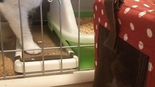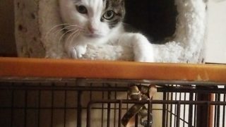 キジ白ちゃん、ケージから少しずつお出かけするように訓練を行います。ちゅーるで誘ってケージからちょっとずつ離れられるようにしていきます。