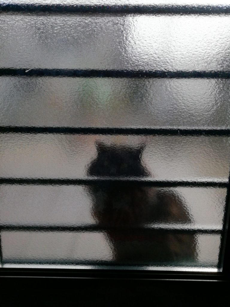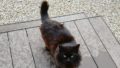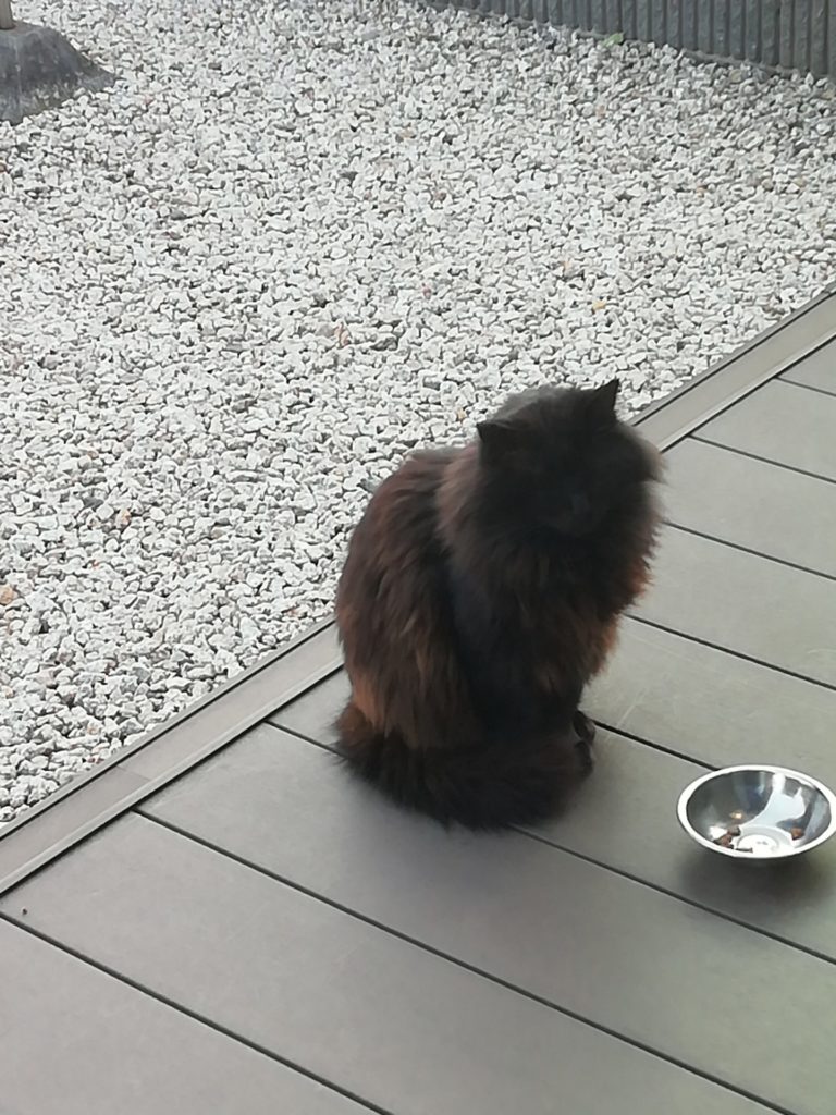 こんにちは、しっぽのいえです。朝早く自宅のドアの外に何かが待ち伏せしています。ドアを開け様子を見てみると、黒モジャくんが目の前でおすわりしています。ごはんをあげました。