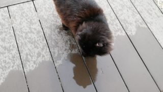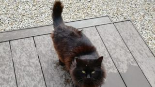 猫 黒モジャくん、仲良し。 こんにちは、しっぽのいえです。寒空に日がさしていると、黒モジャくんがやって来ました。家のウッドデッキに上がって来ました。おやつを与えます。美味しい❓ 2022.02.04 猫野良猫長毛種